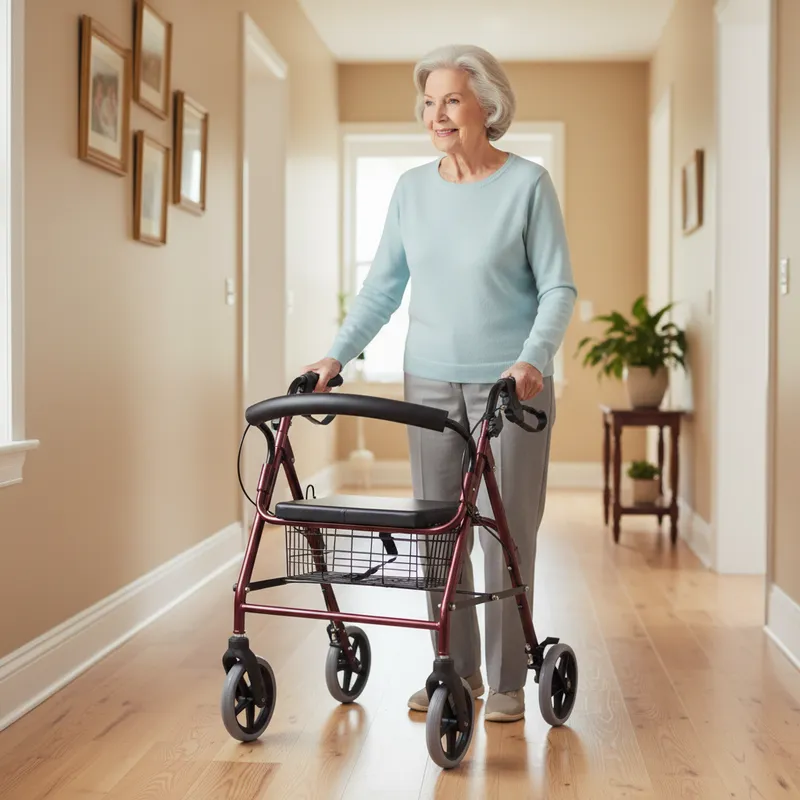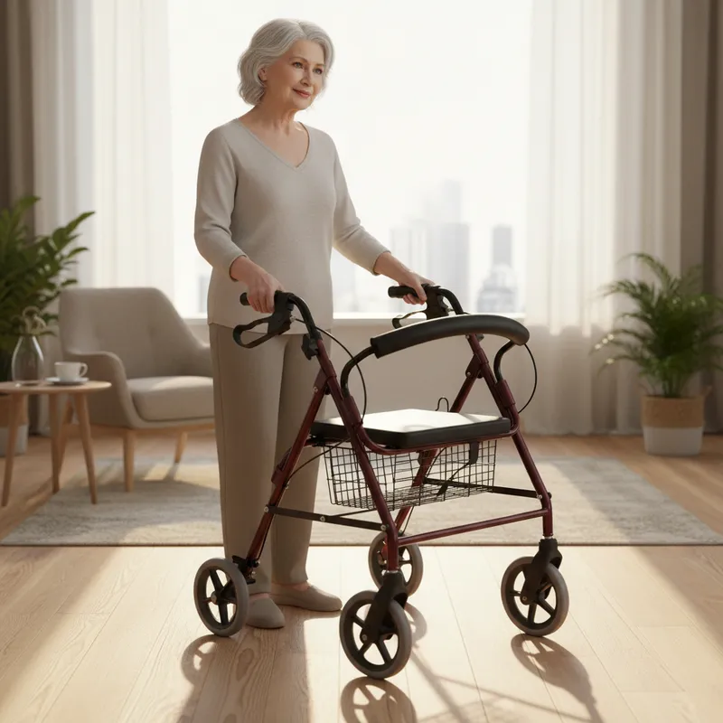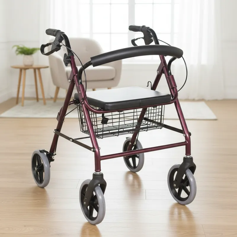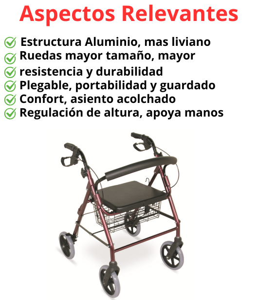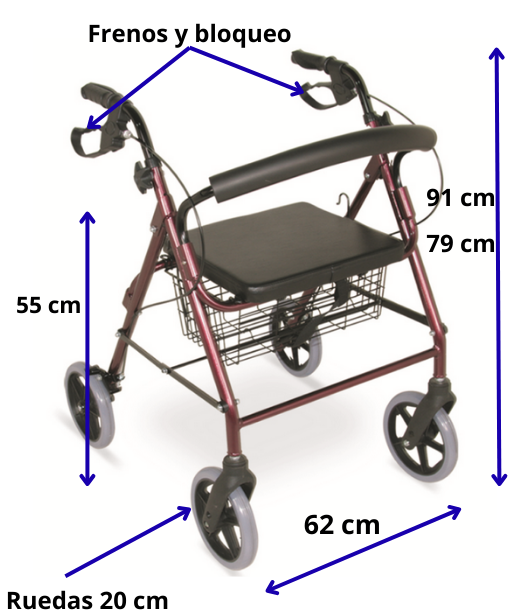 Andador con ruedas y asiento acolchado para descanso, con canasto porta objetos. Ruedas de 8 pulgadas, mas grandes, te brinda mas seguridad, mejor rodaje y durabilidad