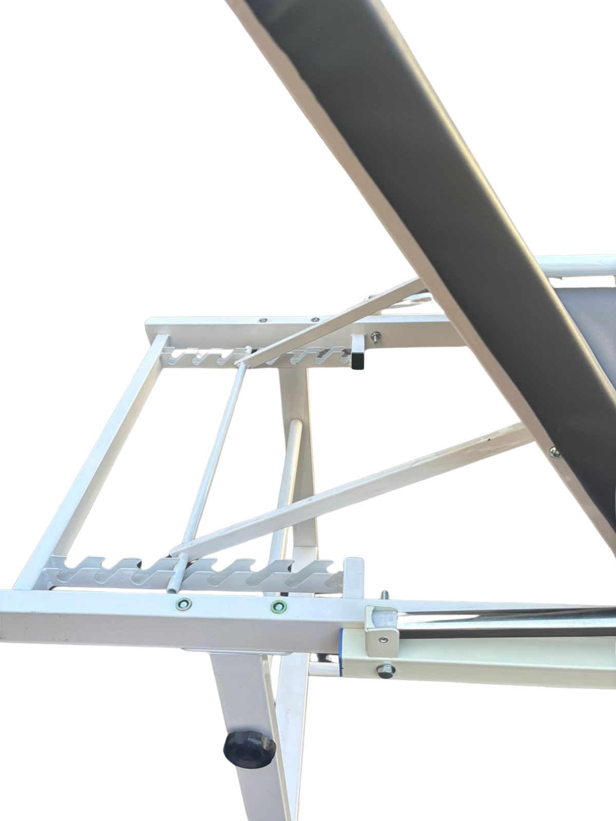 • Respaldo reclinable mediante accionamiento manual, sistema cremallera, con ajuste preciso en cualquier ángulo (elevación), hasta 10 posiciones.