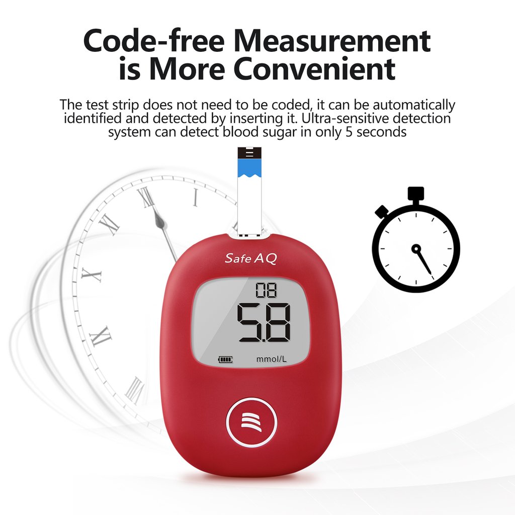 • Sin código de cambio de tiras reactivas, mínimo volumen de sange, medición rápida e instantánea en solo 5 segundos