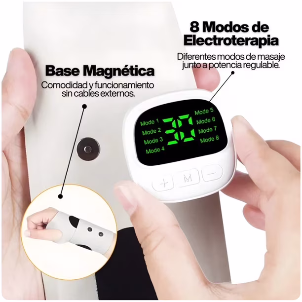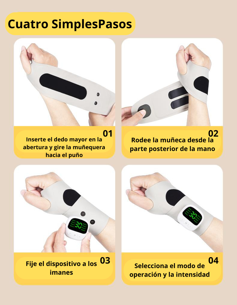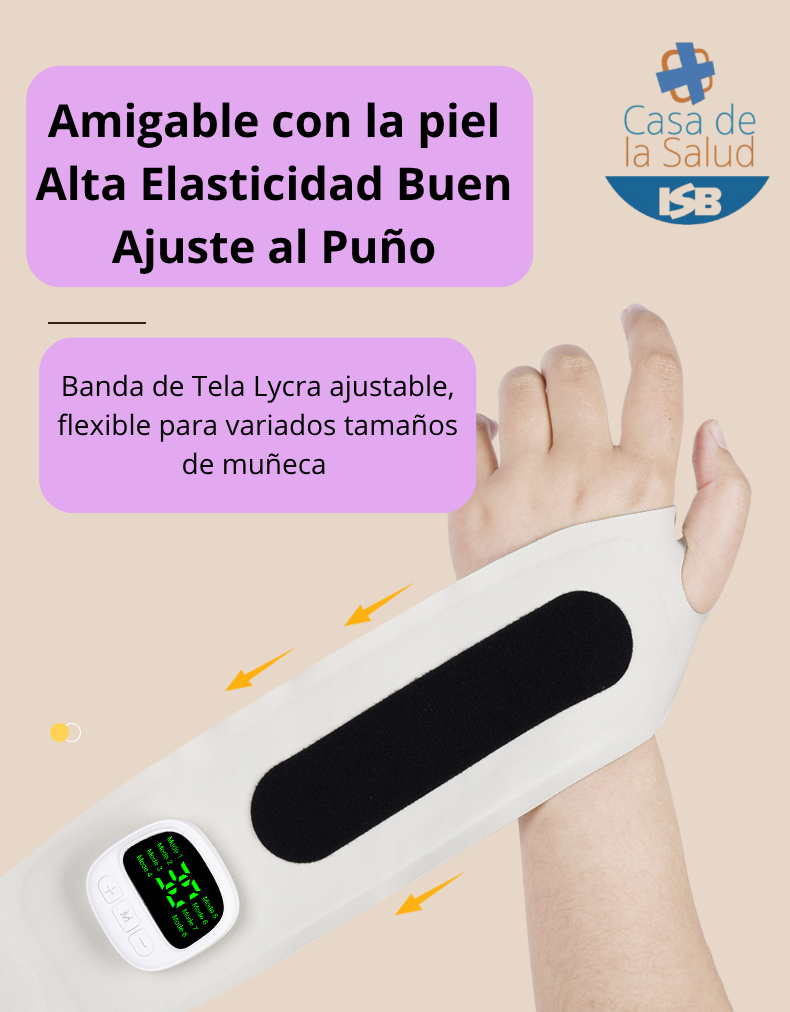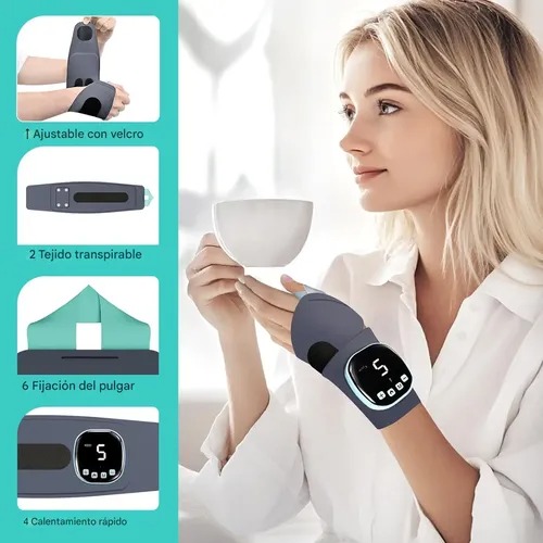 Utiliza impulsos electricos suaves, que estimula los nervios y ayuda a reducir la inflamación, mejora la circulación y relaja los músculos de la mano y muñeca