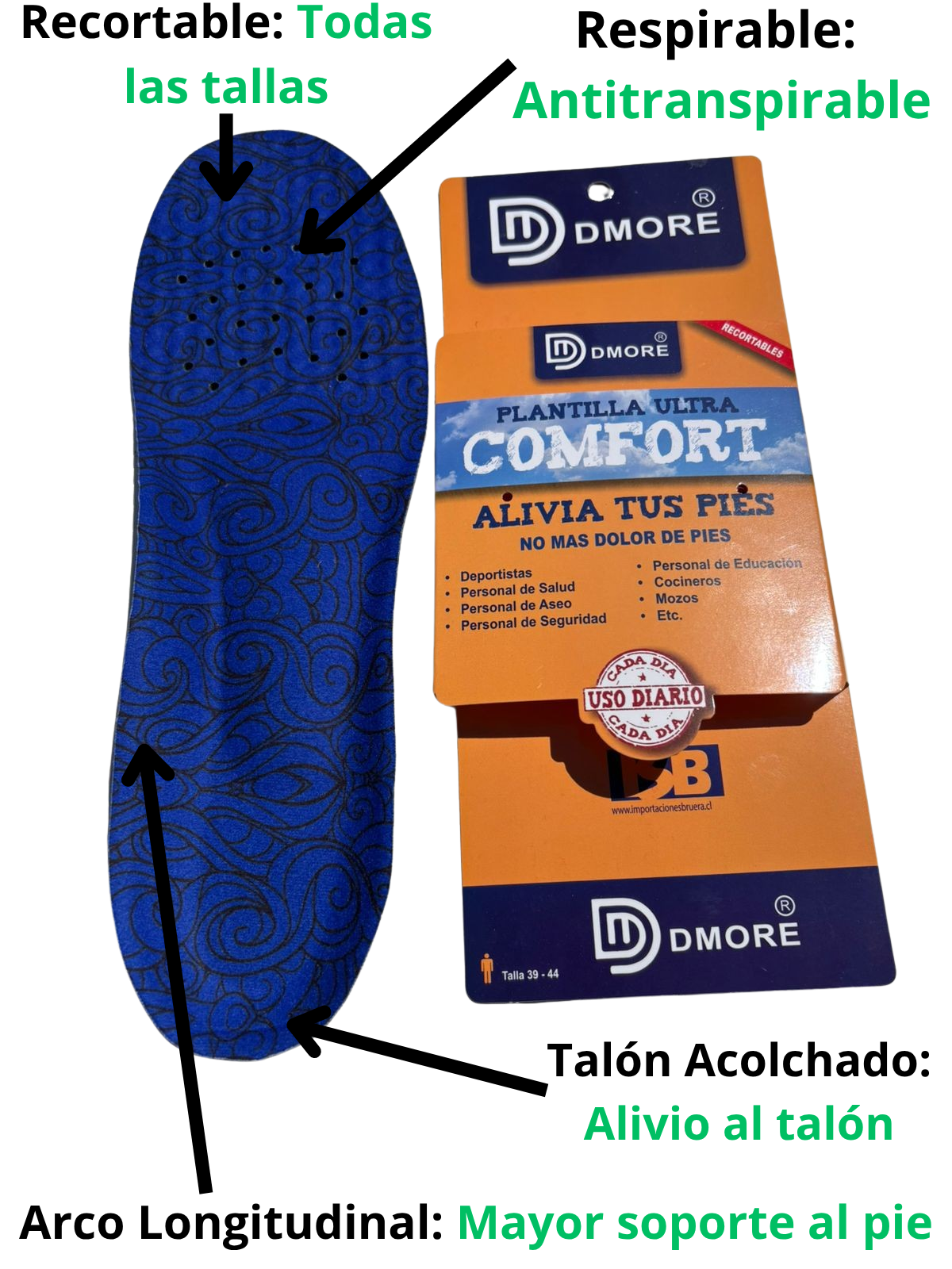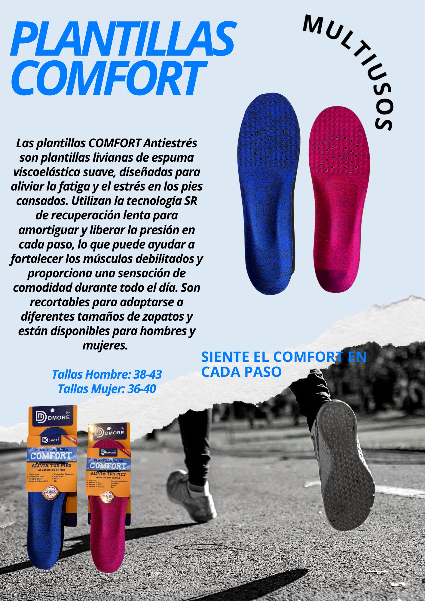 Las Plantillas Ortopédicas Comfort o de Descanso DMORE, son la solución definitiva para el dolor de pie y la fatiga diaria. Están diseñadas para proporcionar alivio efectivo del estrés, ofreciendo comodidad y soporte óptimo a los pies, durante todo el día.