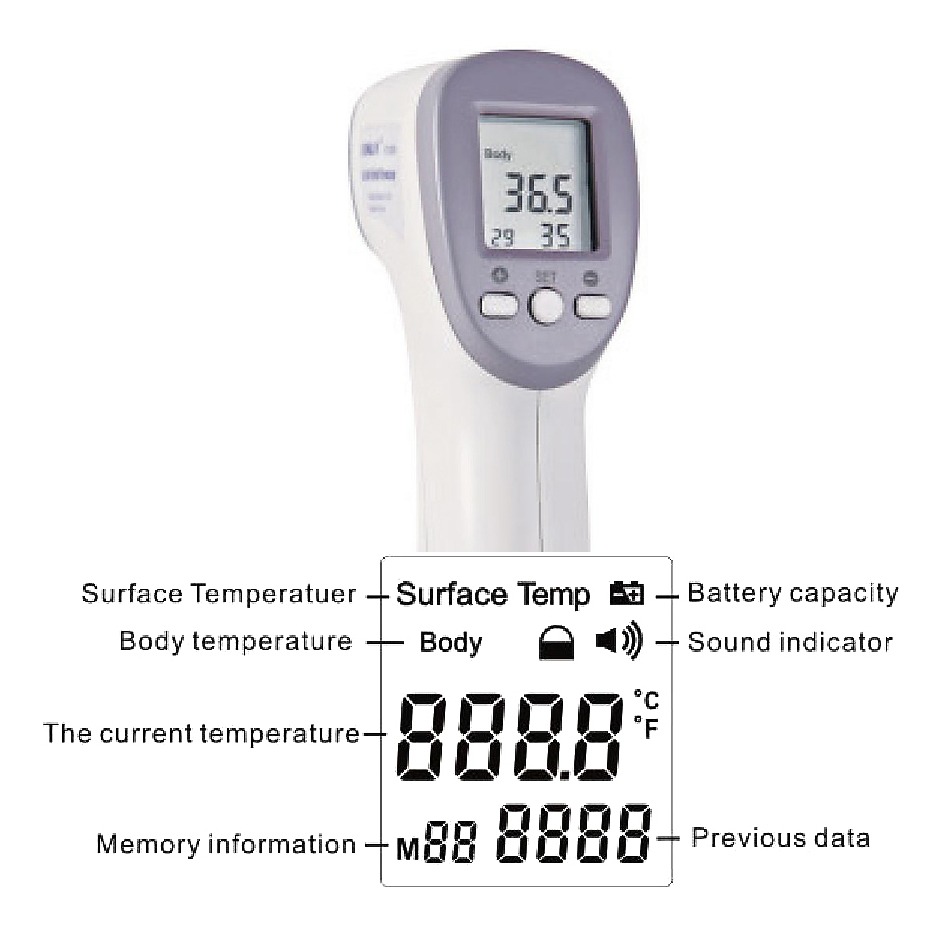 Producto: mediciones precisas sin contacto, seleccionable por el usuario: °C /°F Resolución en pantalla: 0.1°C (0.1°F)